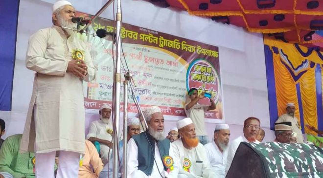 পল্টন ট্রাজেডি দিবস উপলক্ষে পাটকেলঘাটায় আলোচনা সভা ও আলোক চিত্র প্রদর্শনী প্রকাশিত: ৫:৫৩ অপরাহ্ণ, অক্টোবর ২৮, ২০২৪ | আপডেট: ৫:৫৯:অপরাহ্ণ, অক্টোবর ২৮, ২০২৪ ২৮ অক্টোবর ঐতিহাসিক পল্টন ট্রাজেডি দিবস উপলক্ষে সাতক্ষীরার পাটকেলঘাটায় আলোচনা সভা, আলোকচিত্র প্রদর্শনী ও সাংস্কৃতিক অনুষ্ঠান অনুষ্ঠিত হয়েছে। বাংলাদেশ জামায়াতে ইসলামী তালা উপজেলা শাখার আয়োজনে সোমবার(২৮ অক্টোবর) বিকাল ৪টায় পাটকেলঘাটা আদর্শ বহুমূখী উচ্চ বিদ্যালয় মাঠে দিবসটি পালিত হয়। তালা উপজেলা জামায়াতের আমীর মাওলানা মফিদুল্লাহর সভাপতিত্বে অনুষ্ঠানে প্রধান অতিথির বক্তব্য রাখেন, বাংলাদেশ শ্রমিক কল্যাণ ফেডারেশন সাতক্ষীরা জেলার সভাপতি অধ্যাপক গাজী সুজায়েত আলী। বিশেষ অতিথির বক্তব্য রাখেন, বাংলাদেশ জামায়াতে ইসলামী সাতক্ষীরা জেলা শাখার প্রশিক্ষণ সম্পাদক ডাক্তার মাহমুদুল হক, তালা উপজেলা জামায়াতের সাবেক আমির ডাক্তার আফতাব উদ্দিন। তালা উপজেলা জামায়াতের শূরা সদস্য মাওলানা রেজাউল করিমের পরিচালনায় অনুষ্ঠানে আরো বক্তব্য রাখেন, উপজেলা জামায়াতের সেক্রেটারী অধ্যাপক ইদ্রিস আলী, সহকারী সেক্রেটারী অধ্যাপক মাওলানা শফিকুল ইসলাম, ইসলামকাটি ইউনিয়ন পরিষদের চেয়ারম্যান অধ্যাপক গোলাম ফরুক, মাগুরা ইউনিয়নের প্রাক্তন চেয়ারম্যান অধ্যাপক আইয়ুব আলী, শিবিরের জেলা শিক্ষা সম্পাদক আনোয়ার হোসেন সাগর, তালা উপজেলা ইমাম সমিতির সভাপতি মাওলানা মোমতাজ উদ্দীন, ইসলামী ছাত্রশিবিরের তালা উপজেলা সভাপতি জালালুল বান্না, পাটকেলঘাটা থানা সভাপতি নাজমুল হক, হাফেজ শাহ্ আলম, মাওলানা নজরুল ইসলাম প্রমূখ । বক্তারা বলেন: ২০০৬ সালের ২৮ অক্টোবর আওয়ামী সন্ত্রাসীরা পুলিশ প্রশাসনের সহযোগিতায় লগি-বৈঠা দিয়ে নৃশংসভাবে পিটিয়ে-খুঁচিয়ে নিরাপরাধ মানুষকে খুন করে লাশের উপর নৃত্য করে জঘন্যতম বর্বরতার সূচনা করেছিল। সেদিনের লগি বৈঠাধারী সন্ত্রাসীরাই আজকের আগ্নেয়াস্ত্রধারী খুনি ধর্ষক। খুনি হাসিনার নির্দেশে আওয়ামী সন্ত্রাসীরা সেদিন ঢাকা সহ সারাদেশে মেতেছিল খুনের নেশায়। আওয়ামী লীগের লগি-বৈঠার ভয়াবহ নৃশংসতায় জীবন দিতে হয়েছিল সারাদেশে অর্ধশত নিরীহ জনসাধারণের। ২০০৬ সালের ২৮ অক্টোবরে যারা খুনের নেশায় মেতে উঠেছিল অবিলম্বে সেই সকল খুনিদের গ্রেফতার ও দৃষ্টান্তমূলক শাস্তির নিশ্চিত করতে হবে। তখনকার গনমাধ্যমে এই পৈশাচিক ঘটনা বিশ্ববাসীকে প্রত্যক্ষ করিয়েছিল। তখনকার সরকার ঐ ঘটনার তদন্ত করে আসামিদের গ্রেফতার করে বিচারের কোন পদক্ষেপ গ্রহণ করেনি। এ সময় বক্তারা আরো বলেন, ২৮ অক্টোবরের খুনিদের গ্রেফতার করে বিচারের আওতায় যদি আনা হতো, তাহলে আজ ৫ আগষ্ট তৈরি হত না, পালাতে হত না হাজার হাজার মানুষকে, জীবনে দি